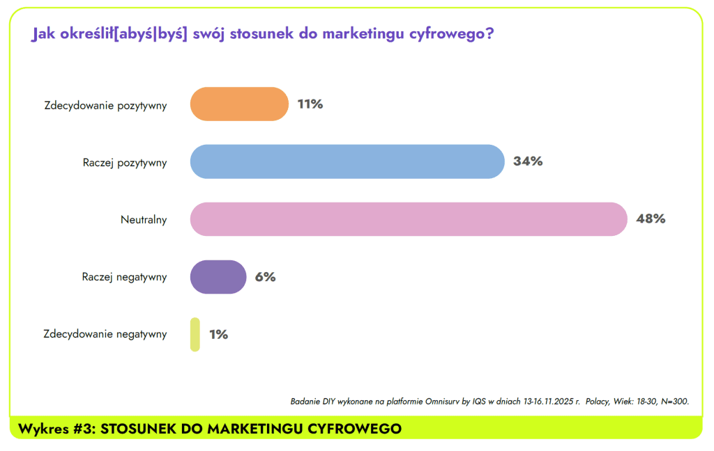 [1] Raport powstał w oparciu o badanie, które na zlecenie IAB Polska wykonane zostało na platformie Omnisurv by IQS w dniach 13-16.11.2025 r., Polacy w wieku 18-30 l., N=300.