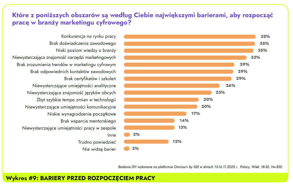 Choć marketing cyfrowy jest postrzegany jako branża atrakcyjna – z bardzo dobrymi warunkami pracy (83% ocen „bardzo dobre” i „raczej dobre”), elastycznością, możliwością pracy zdalnej, kreatywnością i innowacyjnością – to właśnie konkurencja okazuje się największą barierą wejścia. W badaniu 35% respondentów wskazało ją jako główną przeszkodę w rozpoczęciu kariery w digitalu. Co istotne, nie chodzi o brak miejsc pracy czy niskie wynagrodzenia. Problemem jest raczej poczucie zatłoczonego rynku i deklarowana niska wiedza o specyfice pracy w branży.